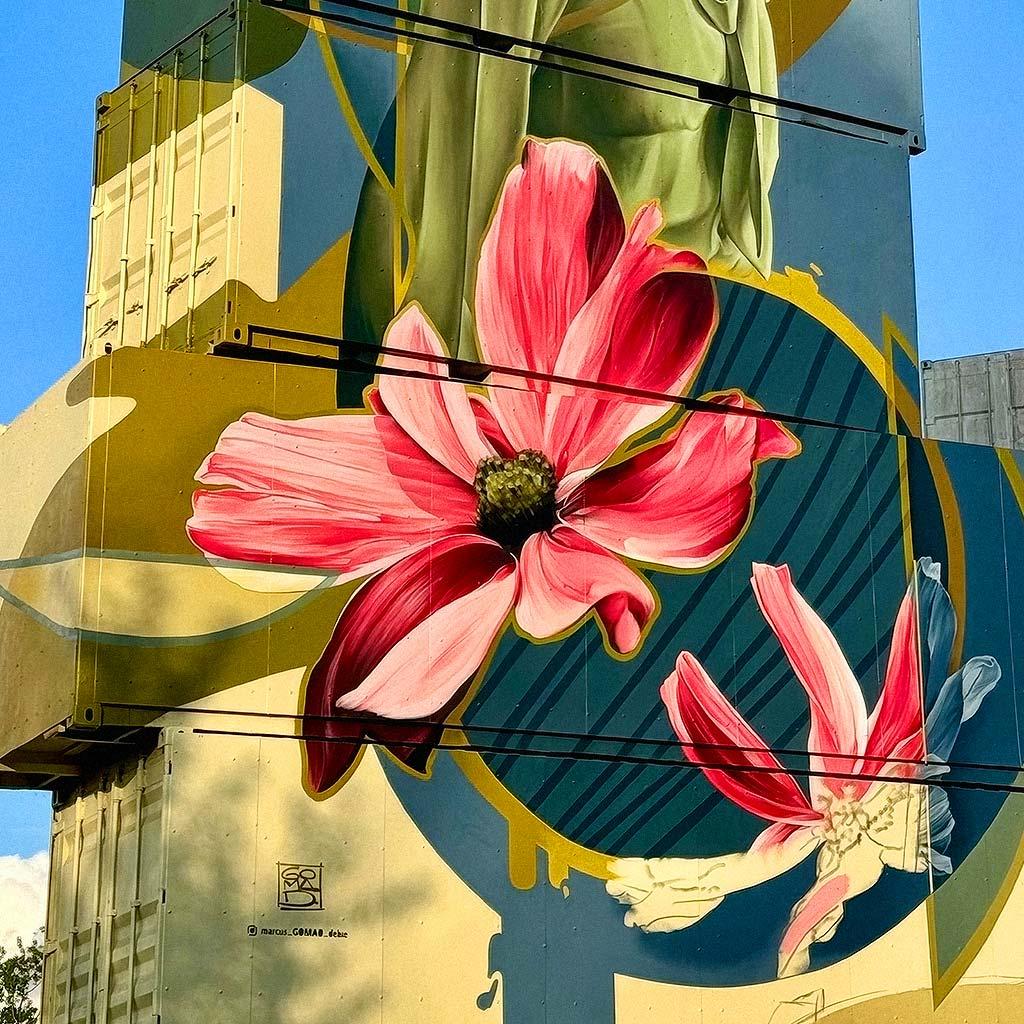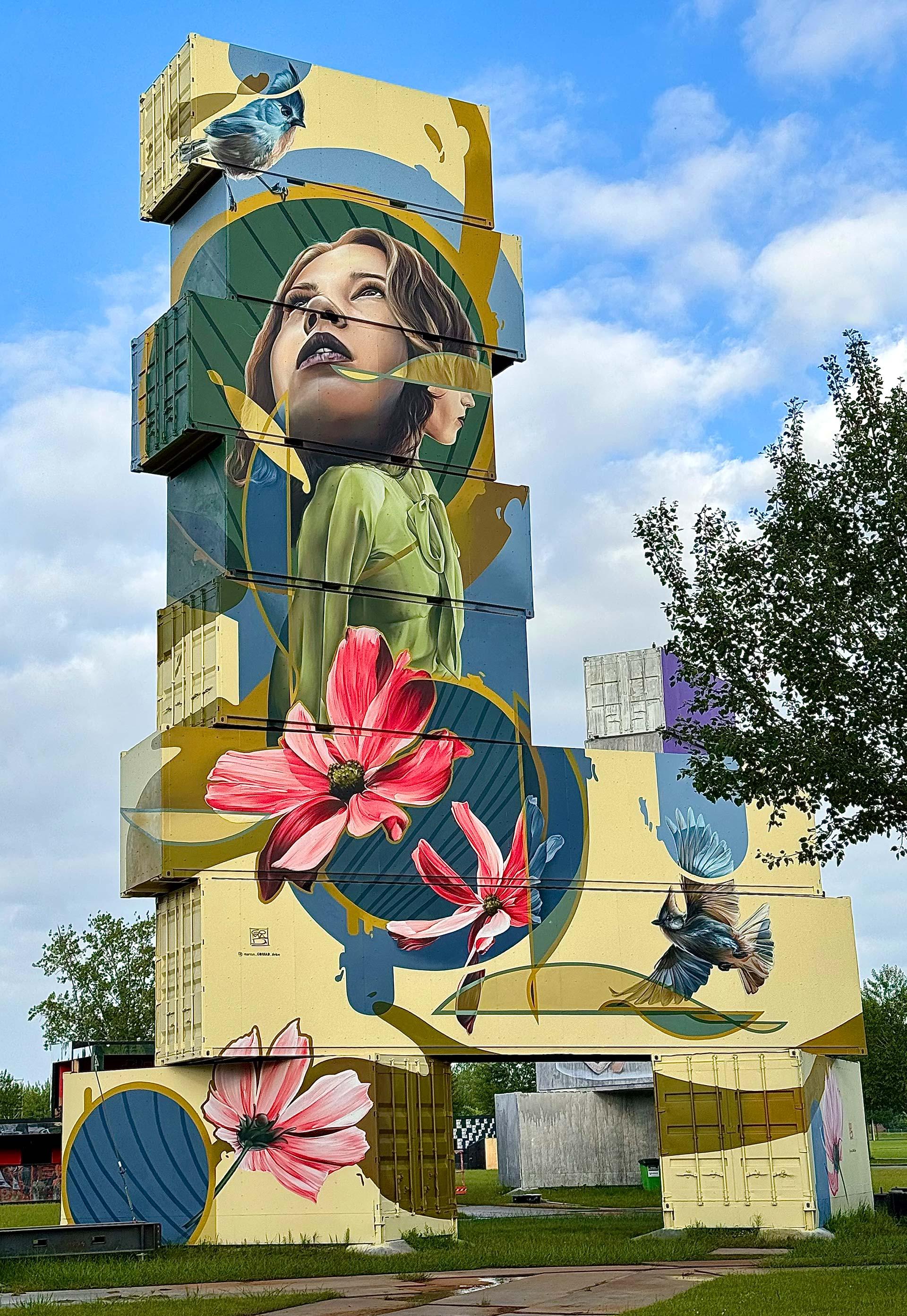 For the Rock Werchter Festival 2024 in Belgium, artist Marcus Debie, also known as 'GOMAD,' created a vibrant artwork filled with colourful flowers and birds. This stunning piece is painted on a 22-meter (72-foot) high container structure for North West Walls, adding a burst of colour to the festival.