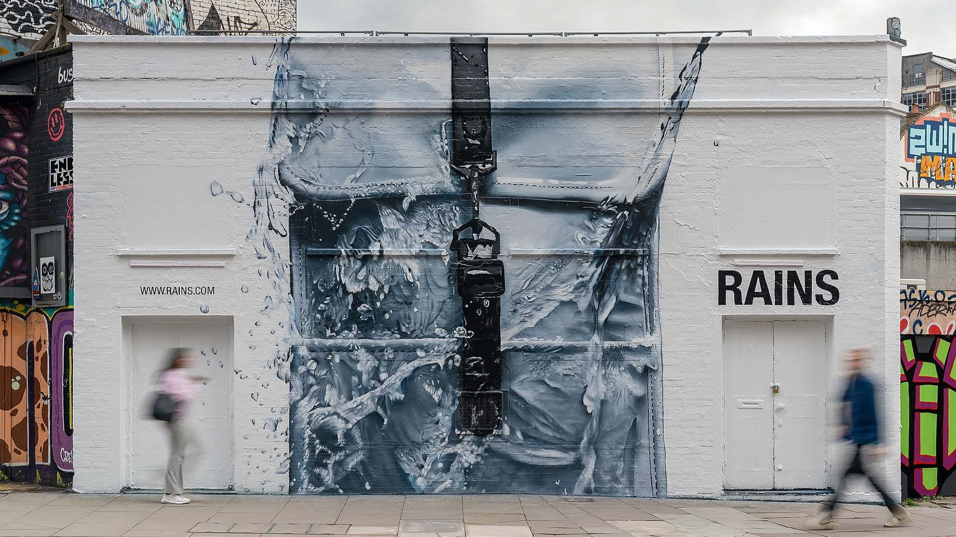 We were commissioned directly by lifestyle brand Rains to paint a mural dedicated to Shoreditch's most popular bag – in the heart of the community that loves it.