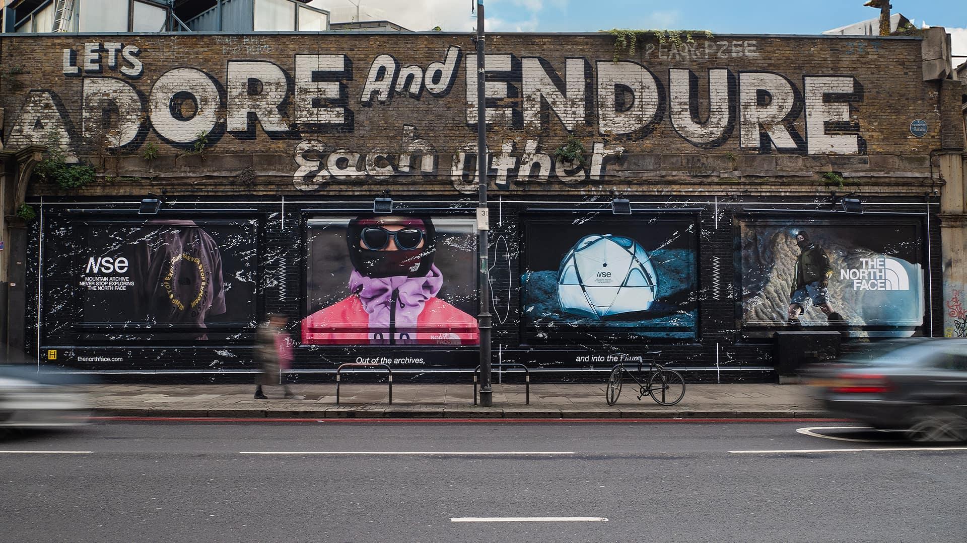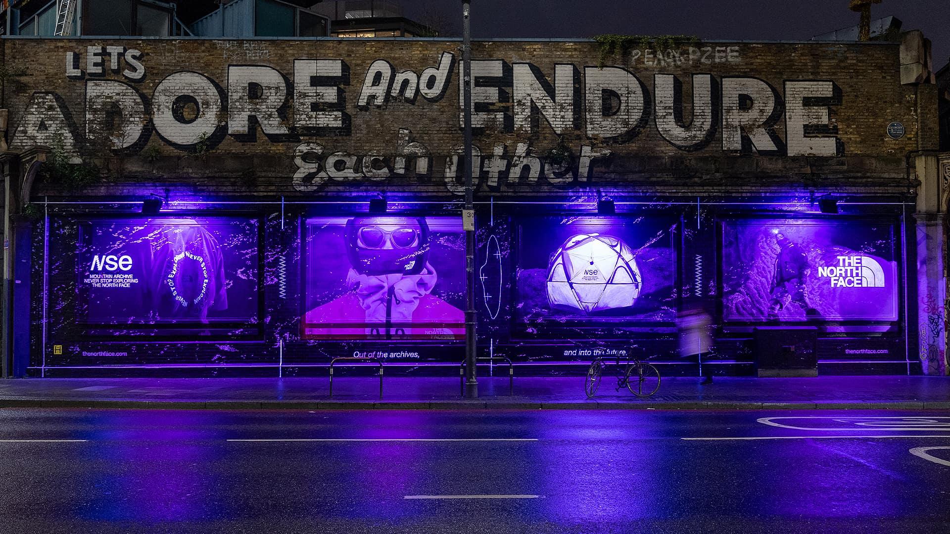 The North Face NSE's new collection reimagined iconic designs from the early 2000s for a new generation of explorers. Inspired by mountain-ready archival pieces, the collection featured a pastel, spring-like palette and cutting-edge Dryvent technology for wind and rain protection with style. We were tasked with designing and producing a mural for our iconic Adore & Endure Wall in Shoreditch to capture the collection’s bold, functional vibe and highlight its reflective features.