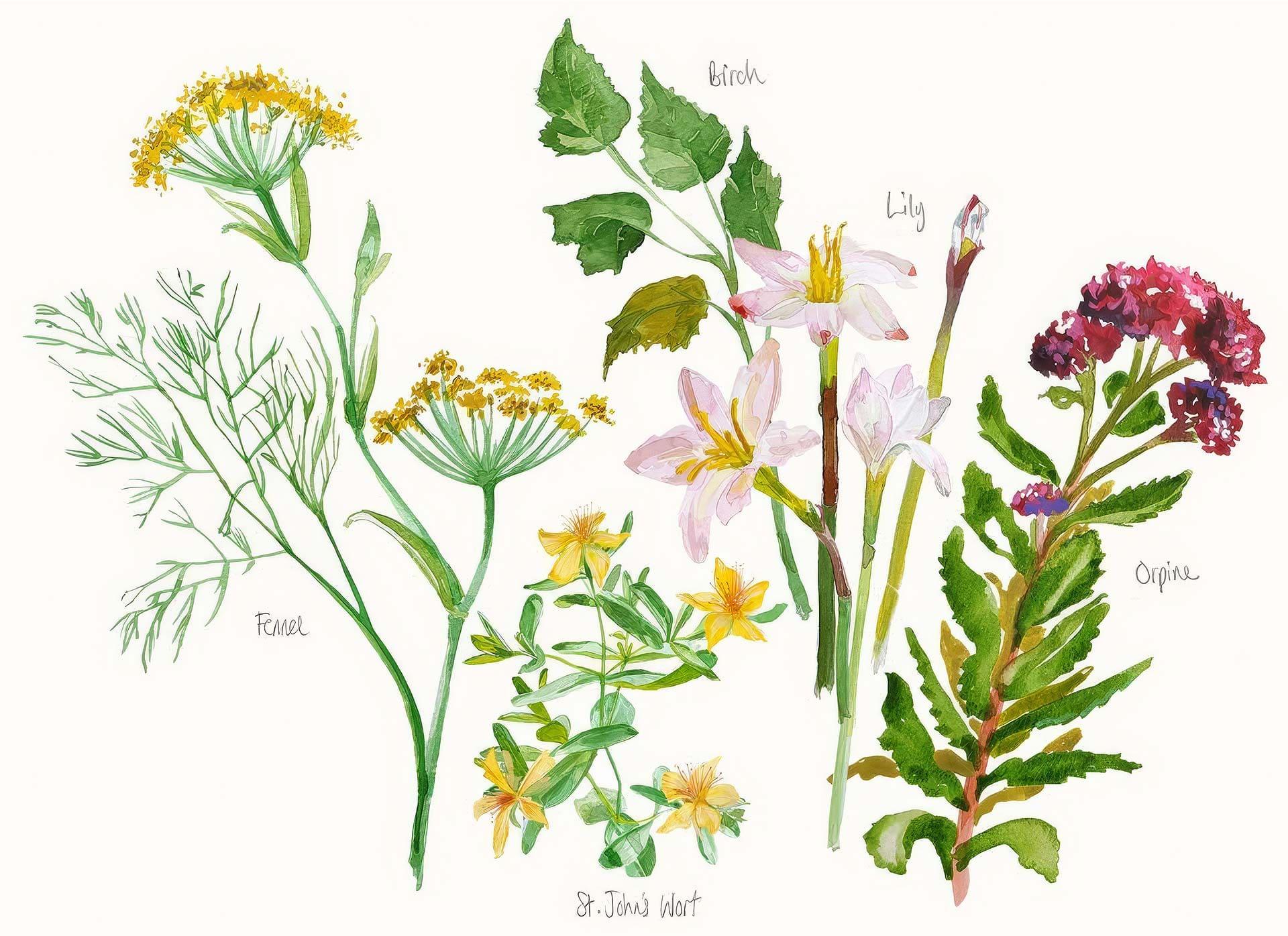 The design features the medicinal plant St. John’s Wort (top right). This bright yellow flowering herb has been used for centuries to treat wounds, burns, depression, and anxiety. Its radiating yellow stamens resemble the sun’s rays, making it a symbol of solar energy and healing light. In 17th-century England, St. John’s Wort was hung over doorways alongside other protective plants to ward off evil spirits.