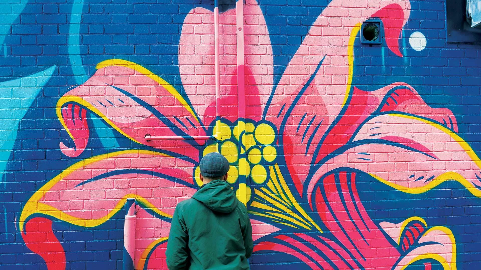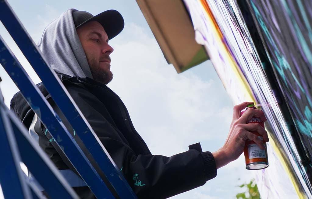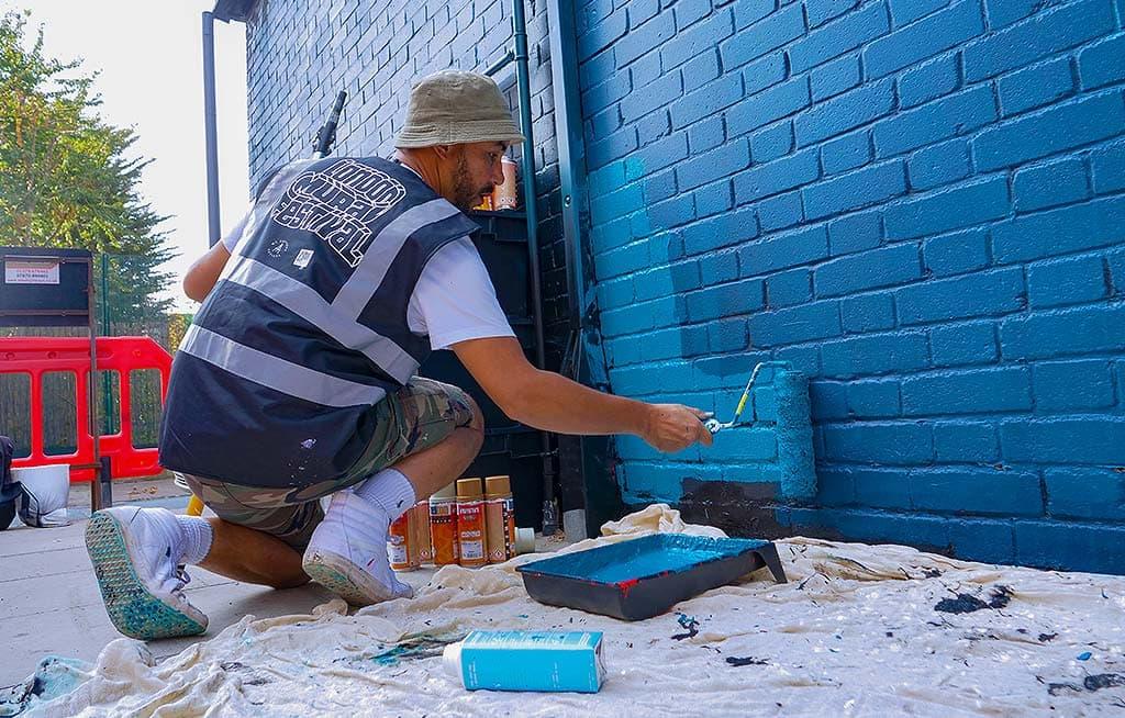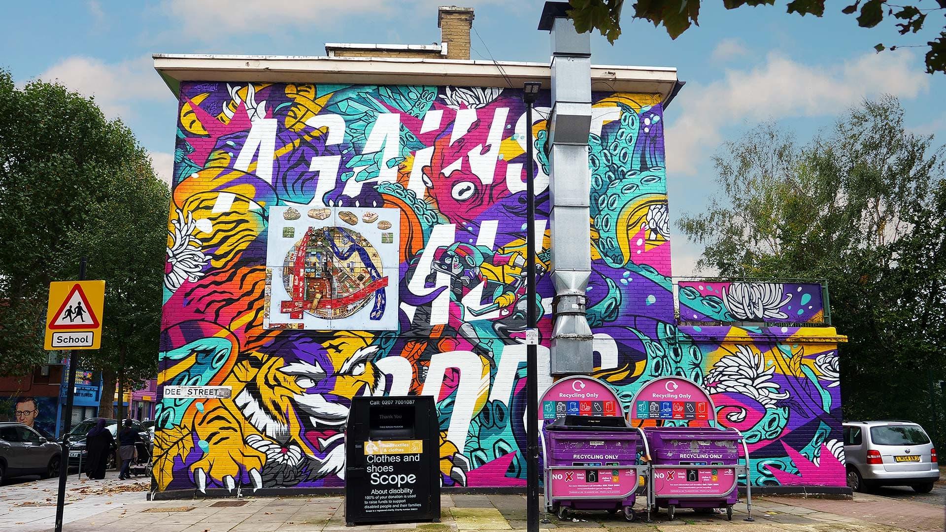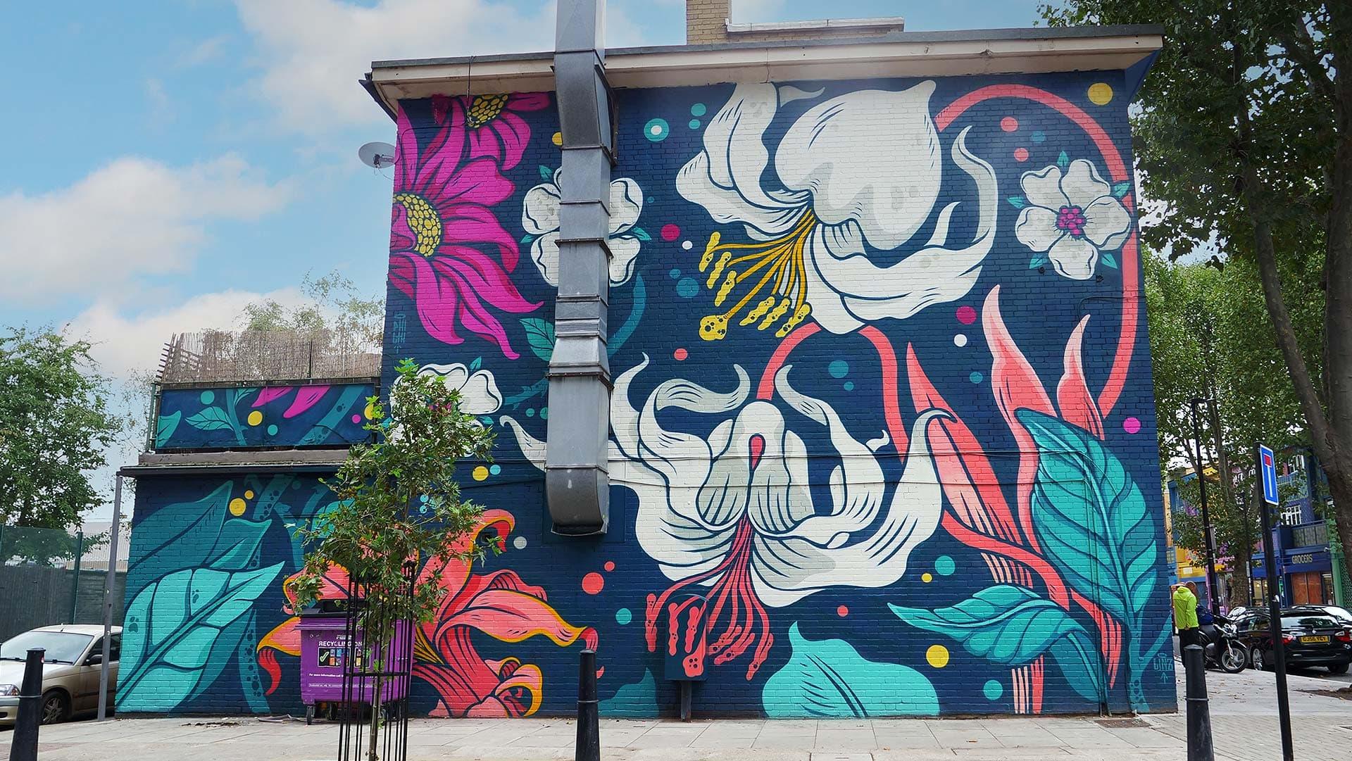 It was great to work with EcoWorld London and Poplar Harca to transform Aberfeldy Street, making it a vibrant and creative community hub. Phill Blake and Captain Kris painted walls in their signature styles, both with a message of hope for the Poplar community. Captain Kris painted the words "Against all odd" and Phill painted some bright flowers in bloom.