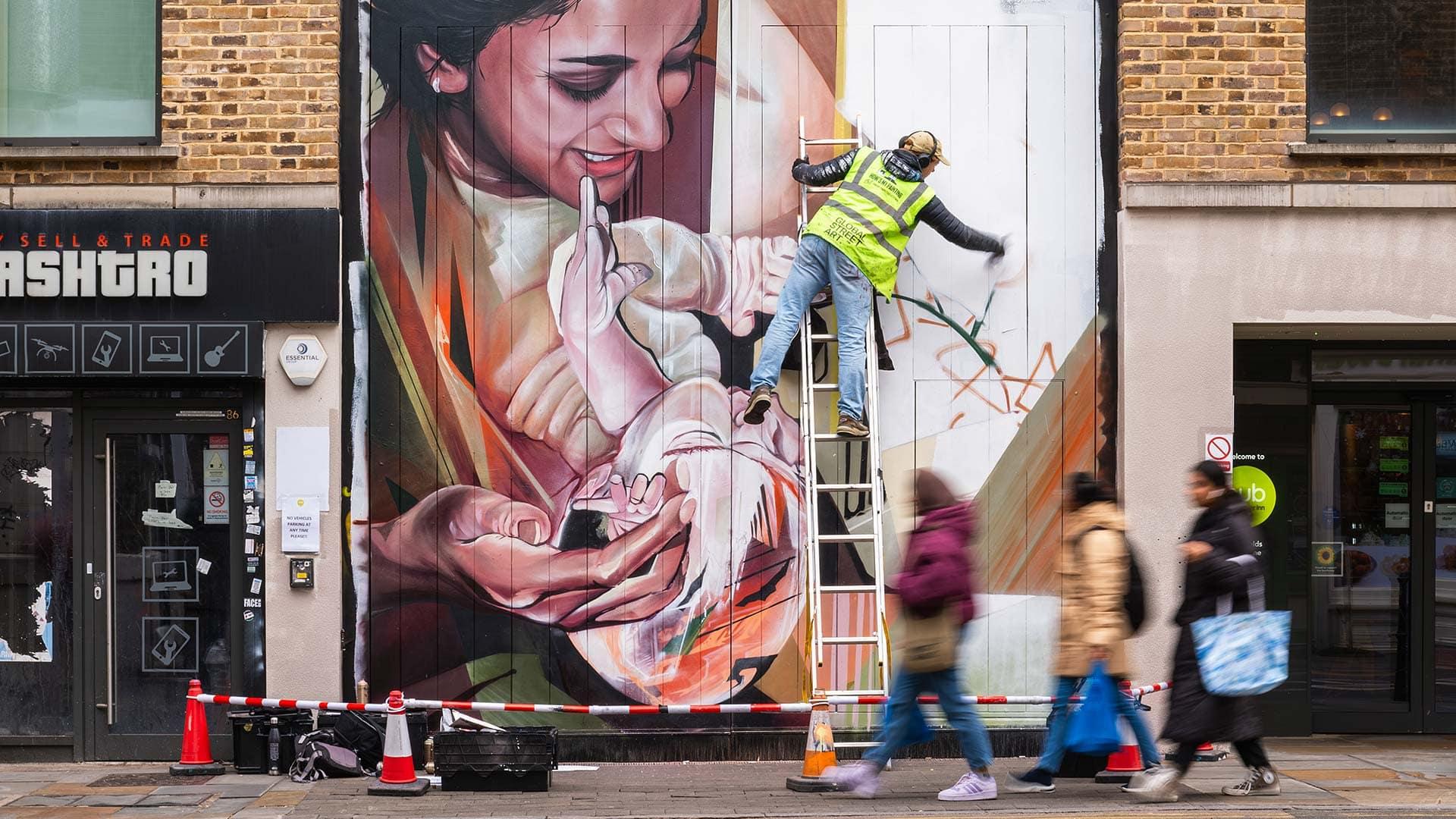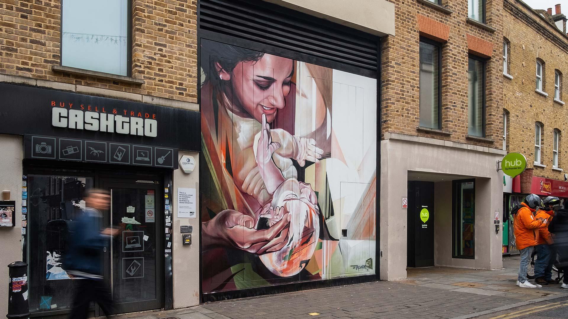 Although the memory of my son’s birth isn’t vivid through the lack of sleep and adrenaline, the intense moment has left a lasting impression. Amidst the shock, a few clear images stuck in my mind which I pieced together for a study in my studio. The most challenging part of composing the image was retaining enough focus on the realism to have that shine through, while the abstract motifs completed the rest of the realistic elements. In all of my paintings I try to have part of the painting speak to one another via direction of line, colour, shape repetition. In this particular painting it was important that my partners focus was firmly on my child, unwavering and elated. I painting him as more abstract to symbolise his coming into this new reality. This piece happens to be the first time I’ve taken one of my studio paintings and replicated it large scale on the street, a process which I will take forward.