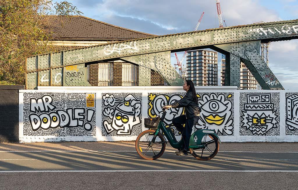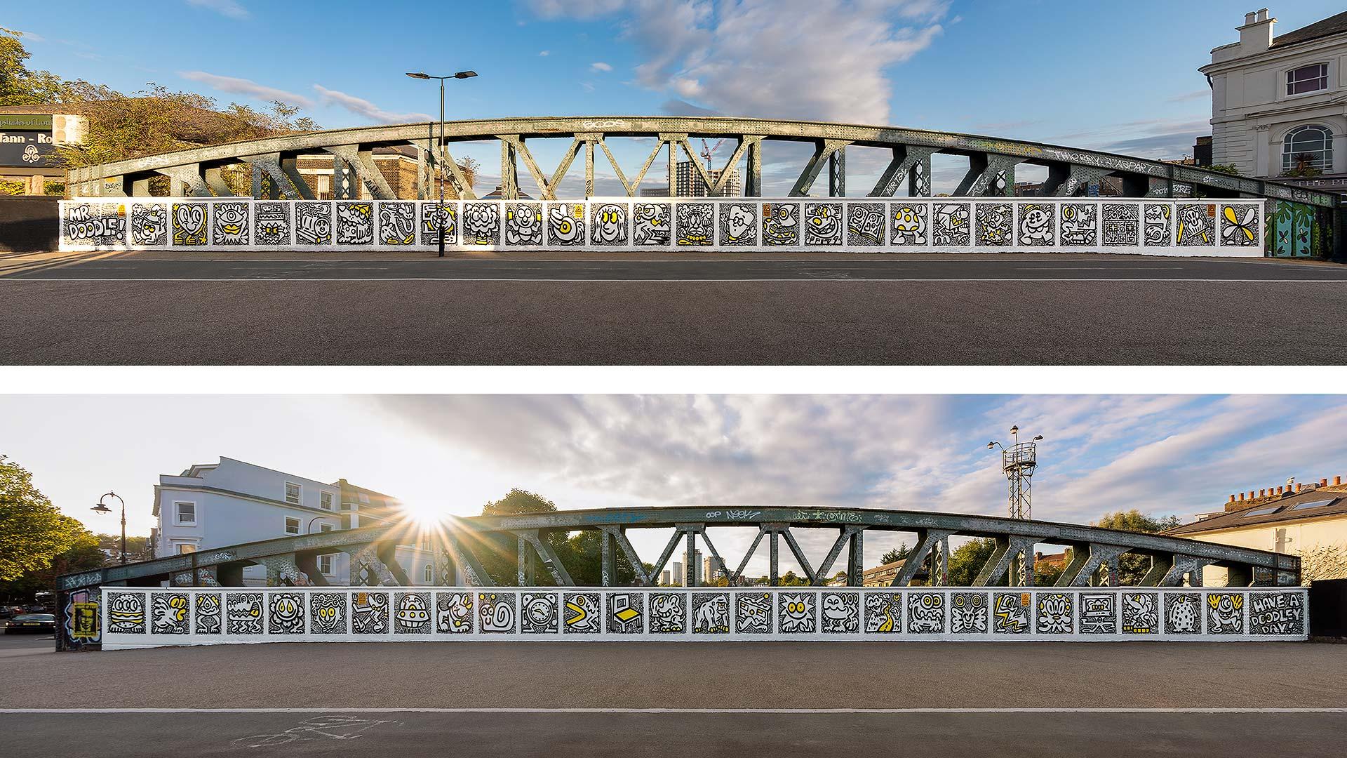 We were so excited to work with the legendary Mr Doodle on an incredible new piece on Regent’s Park Road Footbridge in Camden, completed for the London Mural Festival 2024. The piece was commissioned by Camden Goods Yard, an 8-acre regeneration project by St George, right next to Camden Market on what used to be the old goods depot. This bustling footbridge near Chalk Farm station now proudly sports one of Mr. Doodle’s signature creations.