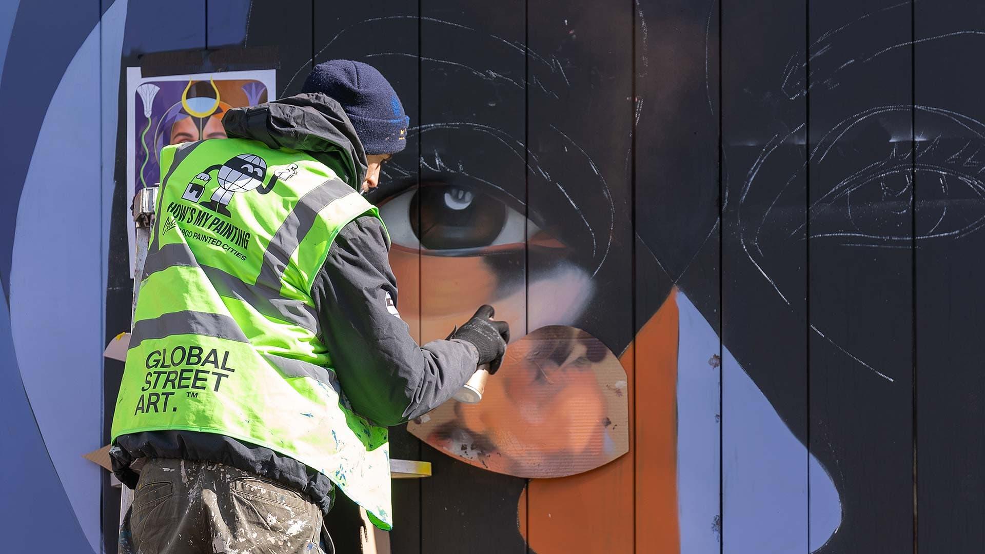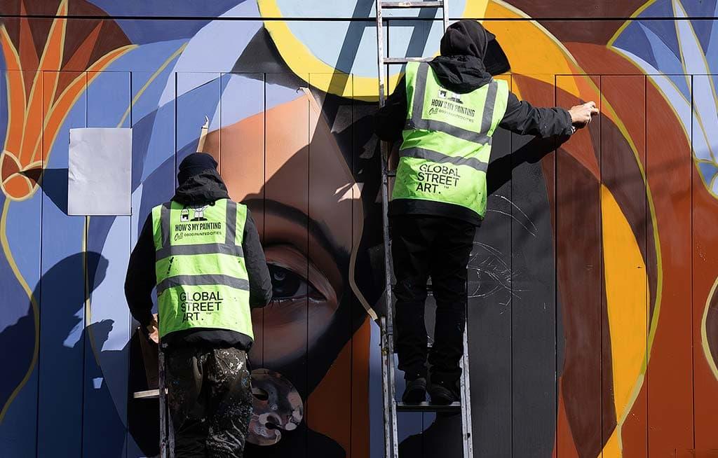 The artwork showcases a portrait skillfully crafted in the duo's signature blend of spray paint photorealism, abstraction, and iconography creating a deeply engaging piece that seamlessly integrates into the rich cultural tapestry of the area.