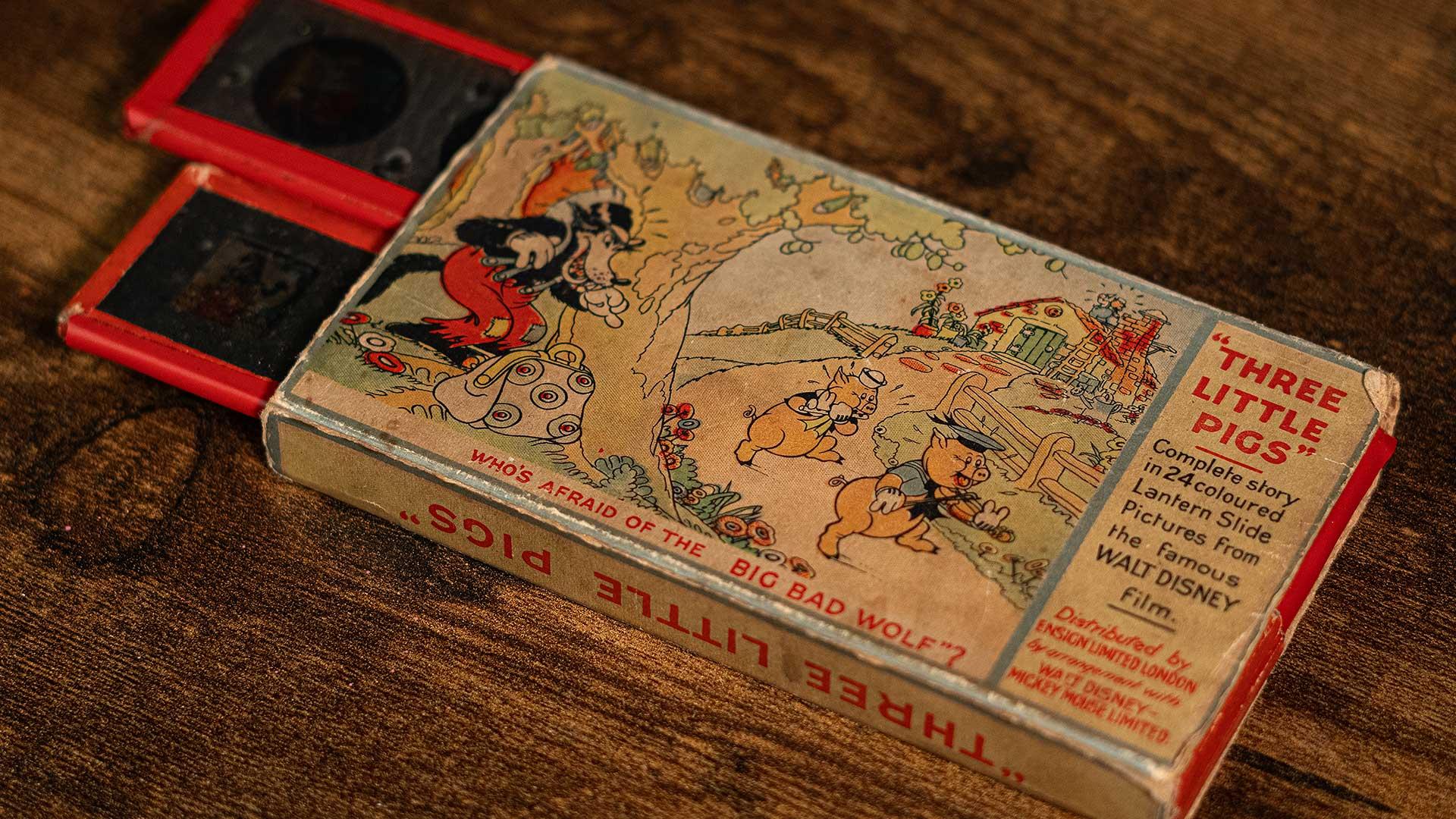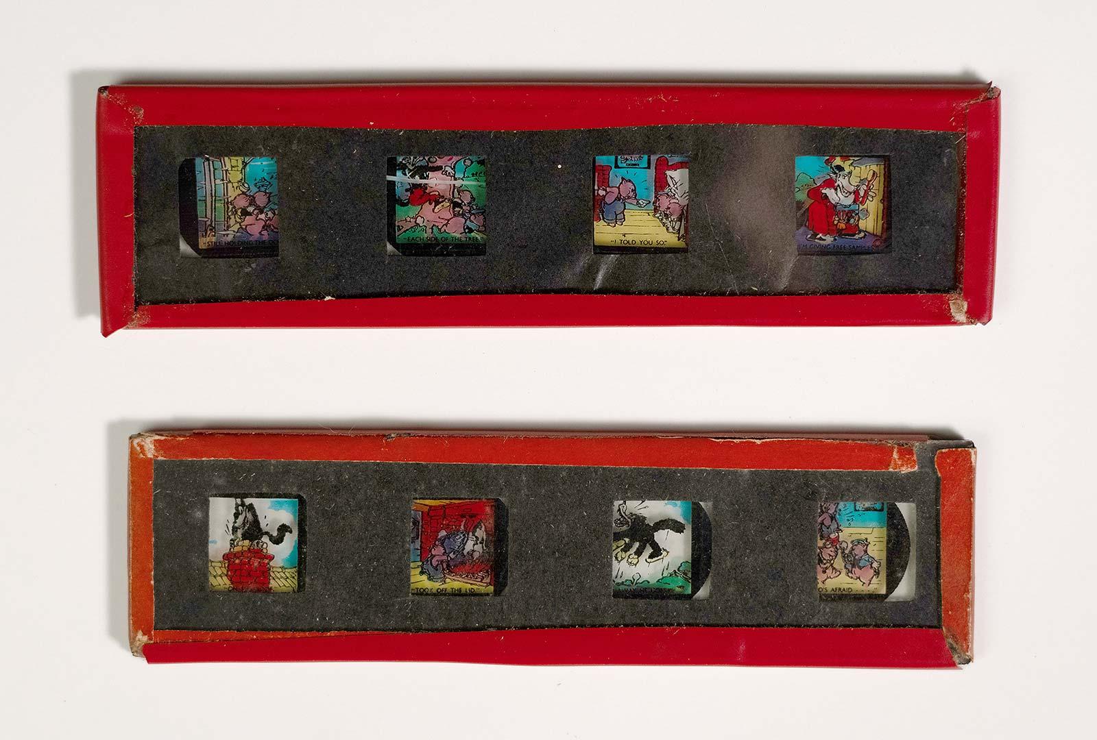 Sets of beautiful slides display Disney’s early animations at a time when simply reading a story aloud and projecting static glass plate slides would have been entertainment enough.